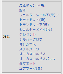 今回ドロップを確認したものは、オリムポス、バレンティア、魔法のマント(黒)、ウェアキャップ(緑)、エレガンス(茶)、ダークスコルピオパンツ、アンクルブーツ(桃) でした。